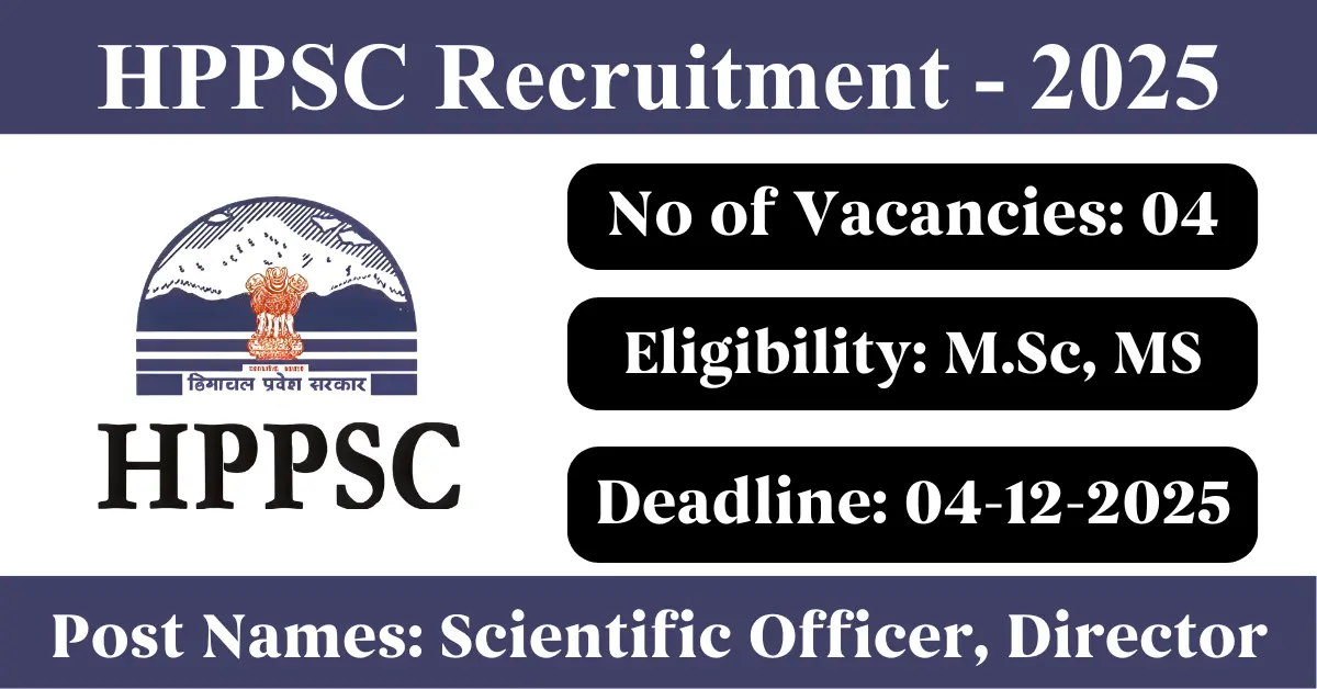 HPPSC Recruitment 2025: Apply for 4 Scientific Officer, Assistant Director vacancies. Himachal Pradesh Public Service Commission invited applications from eligible and interested candidates to fill up Scientific Officer, Assistant Director Posts through HPPSC official notification November 2025. Job seekers who are looking for a career in Shimla – Himachal Pradesh Government can make use of this opportunity. Interested candidates can Apply Online on or before 04-Dec-2025