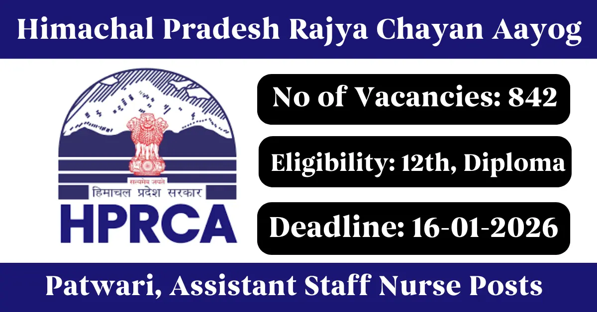 HPRCA Recruitment 2025-26: Apply for 842 Patwari, Assistant Staff Nurse vacancies. Himachal Pradesh Rajya Chayan Aayog invited applications from eligible and interested candidates to fill up Patwari, Assistant Staff Nurse Posts through HPRCA official notification December 2025. Job seekers who are looking for a career in Himachal Pradesh Government can make use of this opportunity. Interested candidates can Apply Online on or before 16-Jan-2026