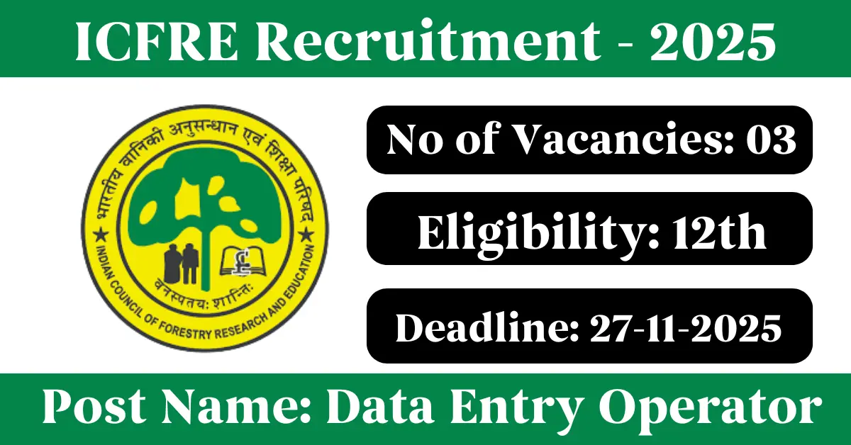 ICFRE Recruitment 2025: Apply for 2 Data Entry Operator vacancies. Indian Council of Forestry Research & Education invited applications from eligible and interested candidates to fill up Data Entry Operator Posts through ICFRE official notification November 2025. Job seekers who are looking for a career in Dehradun – Uttarakhand Government can make use of this opportunity. Interested candidates can attend for Walk-in-interview on 27-Nov-2025