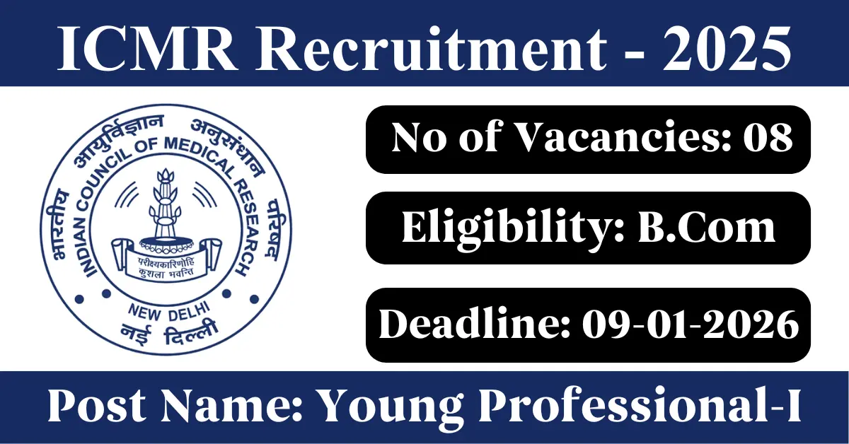 ICMR Recruitment 2025: Apply for 8 Young Professional-I vacancies. Indian Council of Medical Research invited applications from eligible and interested candidates to fill up Young Professional-I Posts through ICMR official notification December 2025. Job seekers who are looking for a career in Delhi – New Delhi Government can make use of this opportunity. Interested candidates can attend for Walk-in-interview on 09-Jan-2026