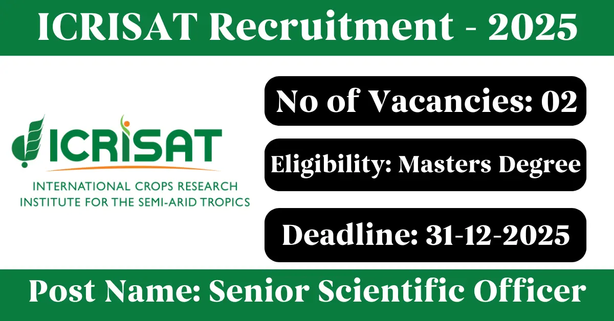 ICRISAT Recruitment 2025: Apply for 2 Senior Scientific Officer vacancies. International Crops Research Institute for the Semi-Arid Tropics invited applications from eligible and interested candidates to fill up Senior Scientific Officer Posts through ICRISAT official notification December 2025. Job seekers who are looking for a career in Hyderabad – Telangana Government can make use of this opportunity. Interested candidates can Apply Online on or before 31-Dec-2025