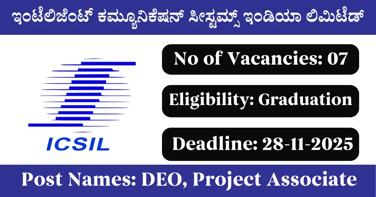 ICSIL Recruitment 2025: Apply for 7 DEO, Project Associate vacancies. Intelligent Communication Systems India Limited invited applications from eligible and interested candidates to fill up DEO, Project Associate Posts through ICSIL official notification November 2025. Job seekers who are looking for a career in Delhi – New Delhi Government can make use of this opportunity. Interested candidates can attend for Walk-in-interview on 28-Nov-2025
