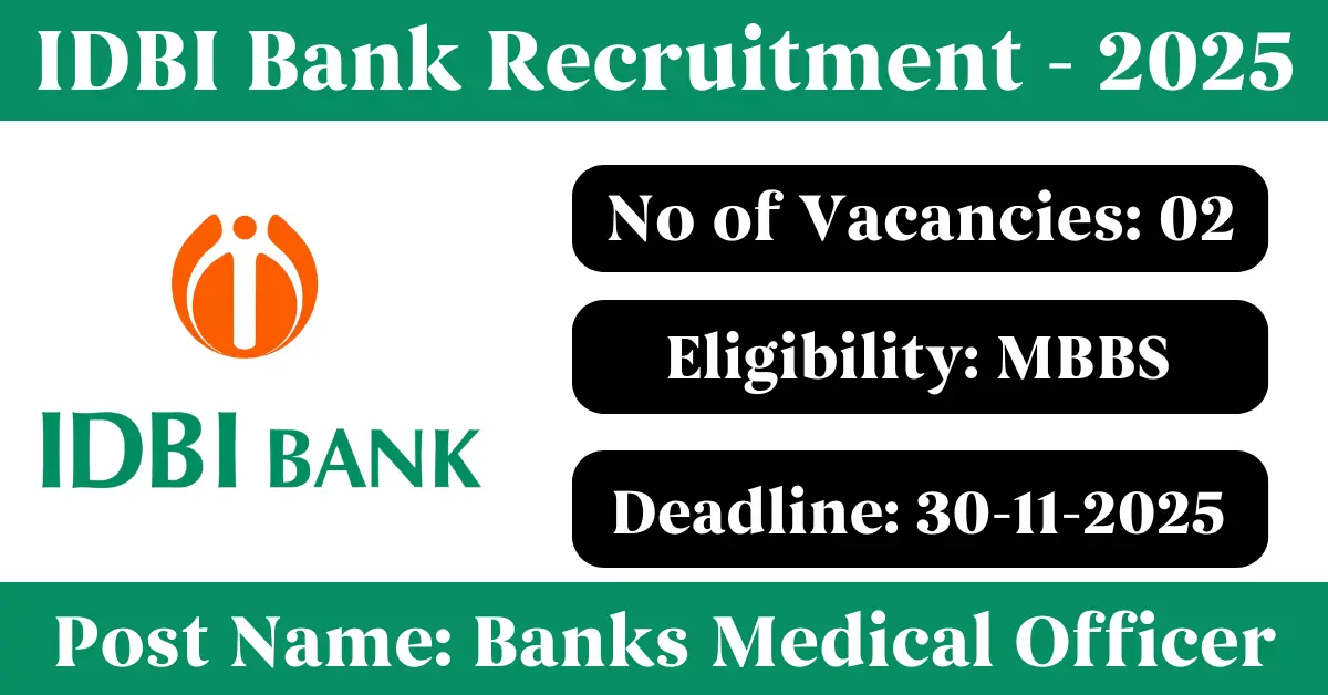 IDBI Bank Recruitment 2025: Apply for 2 Banks Medical Officer vacancies. Industrial Development Bank of India invited applications from eligible and interested candidates to fill up Banks Medical Officer Posts through IDBI Bank official notification November 2025. Job seekers who are looking for a career in Kochi – Kerala, Thane – Maharashtra Government can make use of this opportunity. Interested candidates can Apply Offline on or before 30-Nov-2025