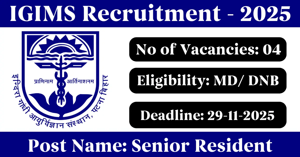 IGIMS Recruitment 2025: Apply for 4 Senior Resident vacancies. Indira Gandhi Institute of Medical Sciences invited applications from eligible and interested candidates to fill up Senior Resident Posts through IGIMS official notification November 2025. Job seekers who are looking for a career in Patna – Bihar Government can make use of this opportunity. Interested candidates can attend for Walk-in-interview on 29-Nov-2025
