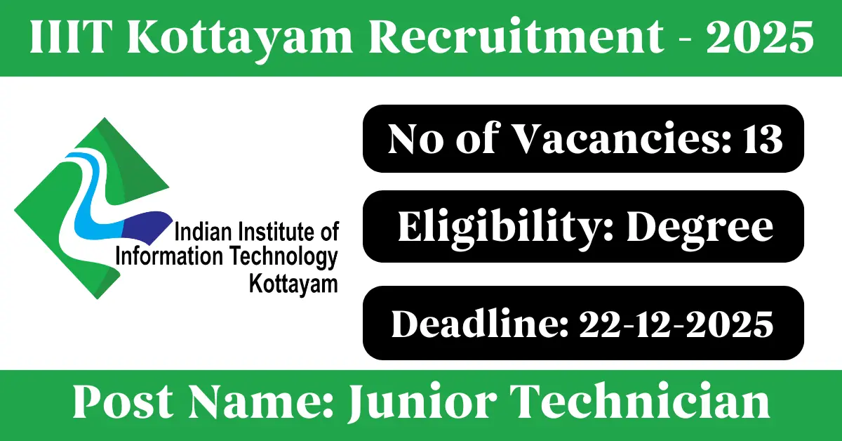 IIIT Kottayam Recruitment 2025: Apply for 13 Junior Technician vacancies. Indian Institute of Information Technology Kottayam invited applications from eligible and interested candidates to fill up Junior Technician Posts through IIIT Kottayam official notification November 2025. Job seekers who are looking for a career in Kottayam – Kerala Government can make use of this opportunity. Interested candidates can Apply Online on or before 22-Dec-2025
