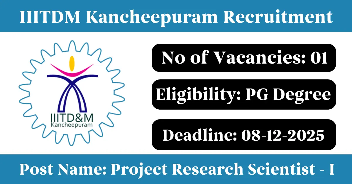 IIITDM Kancheepuram Recruitment 2025: Apply for 1 Project Research Scientist I vacancies. Indian Institute of Information Technology Design & Manufacturing Kancheepuram invited applications from eligible and interested candidates to fill up Project Research Scientist I Posts through IIITDM Kancheepuram official notification November 2025. Job seekers who are looking for a career in Kancheepuram – Tamil Nadu Government can make use of this opportunity. Interested candidates can attend for Walk-in-interview on 08-Dec-2025