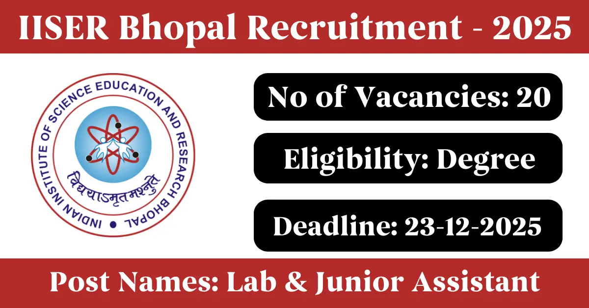 IISER Bhopal Recruitment 2025: Apply for 20 Lab Assistant vacancies. Indian Institute of Science Education and Research Bhopal invited applications from eligible and interested candidates to fill up Lab Assistant Posts through IISER Bhopal official notification November 2025. Job seekers who are looking for a career in Bhopal – Madhya Pradesh Government can make use of this opportunity. Interested candidates can Apply Online/Offline on or before 23-Dec-2025