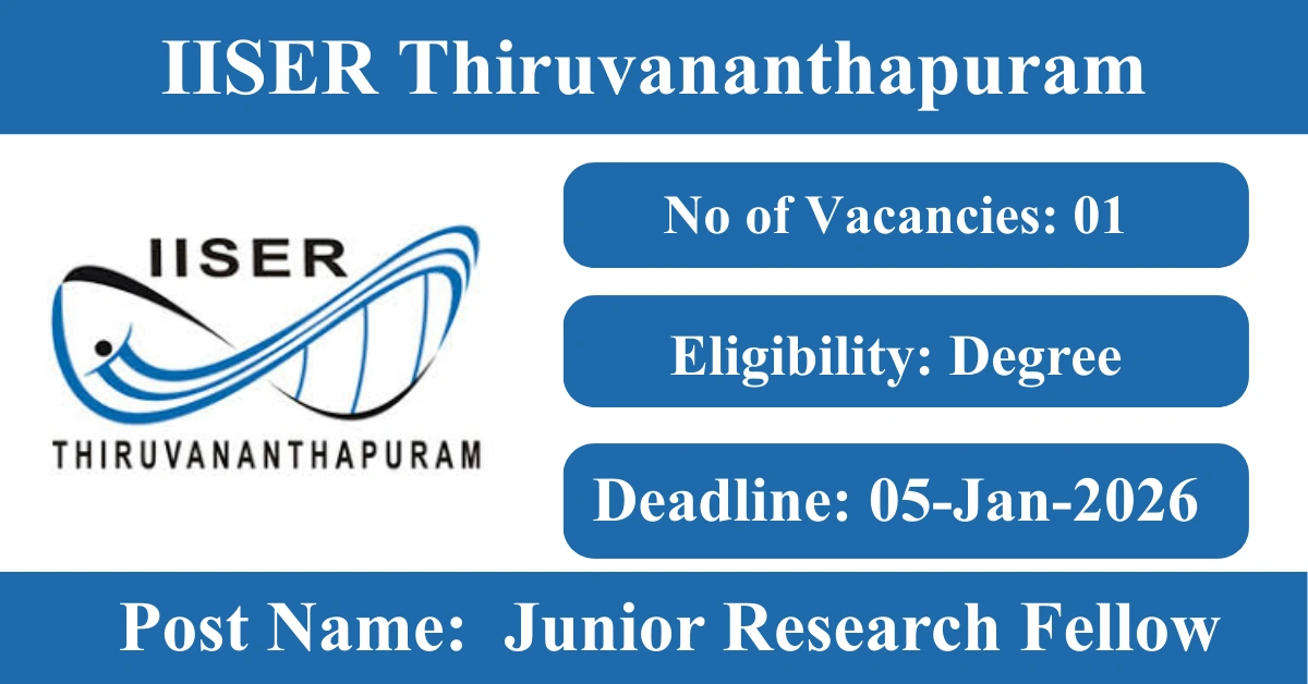IISER Thiruvananthapuram Recruitment 2026: Apply for 1 Junior Research Fellow vacancies. Indian Institute of Science Education and Research Thiruvananthapuram invited applications from eligible and interested candidates to fill up Junior Research Fellow Posts through IISER Thiruvananthapuram official notification January 2026. Job seekers who are looking for a career in Thiruvananthapuram – Kerala Government can make use of this opportunity. Interested candidates can send an E-Mail on or before 05-Jan-2026
