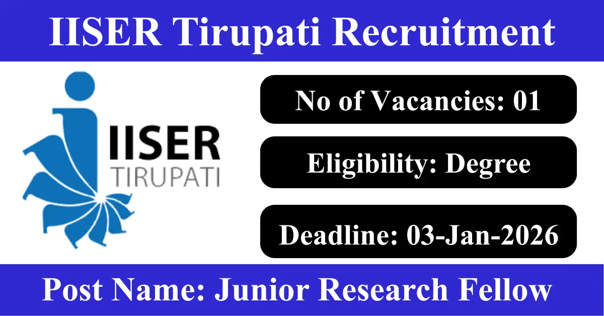 IISER Tirupati Recruitment 2026: Apply for 1 Junior Research Fellow / Project Associate – I vacancies. Indian Institute of Science Education and Research Tirupati invited applications from eligible and interested candidates to fill up Junior Research Fellow / Project Associate – I Posts through IISER Tirupati official notification December 2025. Job seekers who are looking for a career in Tirupati – Andhra Pradesh Government can make use of this opportunity. Interested candidates can send an E-Mail on or before 03-Jan-2026