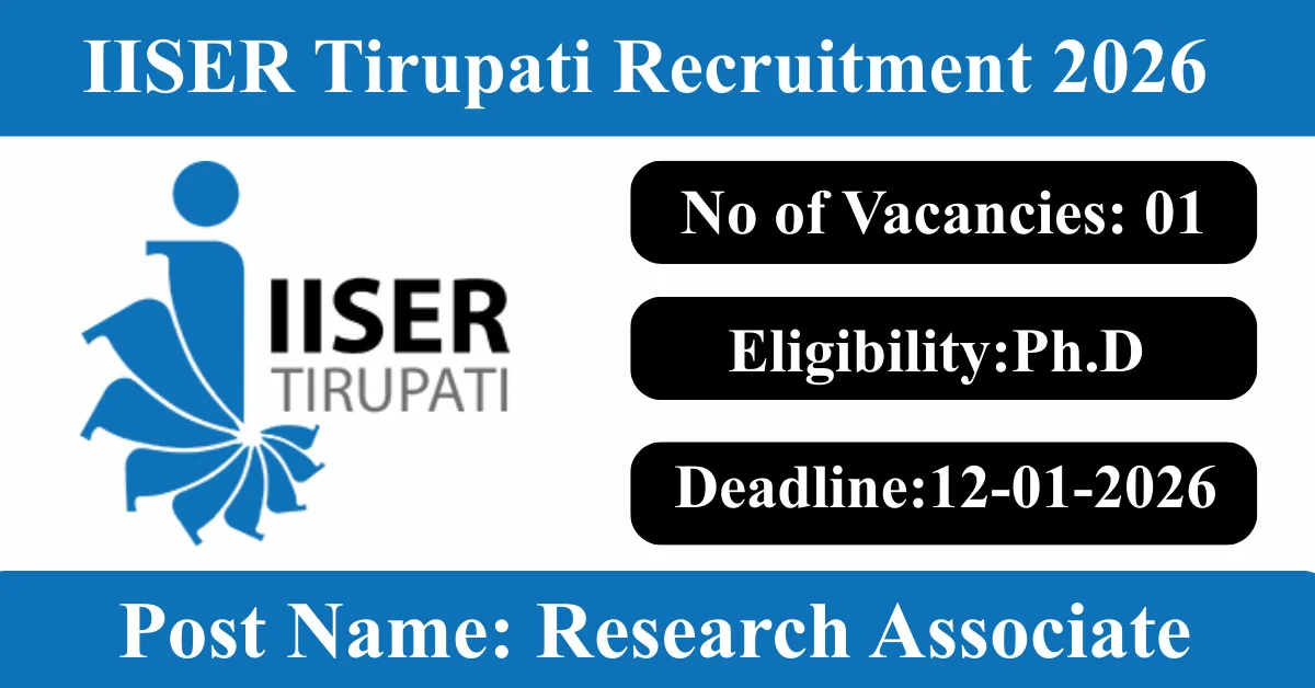 IISER Tirupati Recruitment 2026: Apply for 1 Research Associate-1 vacancies. Indian Institute of Science Education and Research Tirupati invited applications from eligible and interested candidates to fill up Research Associate-1 Posts through IISER Tirupati official notification January 2026. Job seekers who are looking for a career in Tirupati – Andhra Pradesh Government can make use of this opportunity. Interested candidates can send an E-Mail on or before 12-Jan-2026
