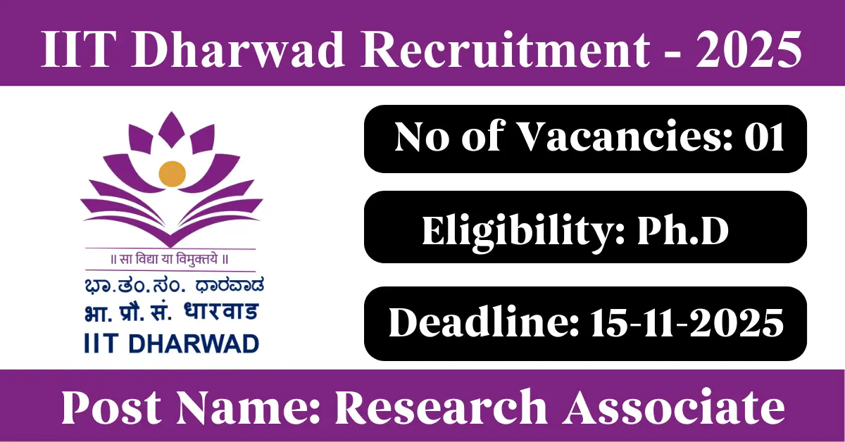 IIT Dharwad Recruitment 2025: Apply for 1 Research Associate vacancies. Indian Institute of Technology Dharwad invited applications from eligible and interested candidates to fill up Research Associate Posts through IIT Dharwad official notification November 2025. Job seekers who are looking for a career in Dharwad – Karnataka Government can make use of this opportunity. Interested candidates can Apply Online on or before 15-Nov-2025