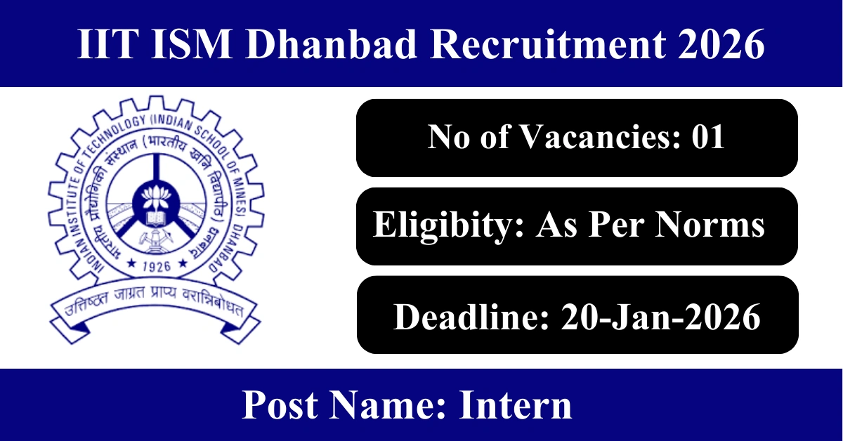 IIT ISM Dhanbad Recruitment 2026: Apply for 1 Intern vacancies. Indian Institute of Technology (Indian School of Mines), Dhanbad invited applications from eligible and interested candidates to fill up Intern Posts through IIT ISM Dhanbad official notification January 2026. Job seekers who are looking for a career in Dhanbad – Jharkhand Government can make use of this opportunity. Interested candidates can send an E-Mail on or before 20-Jan-2026
