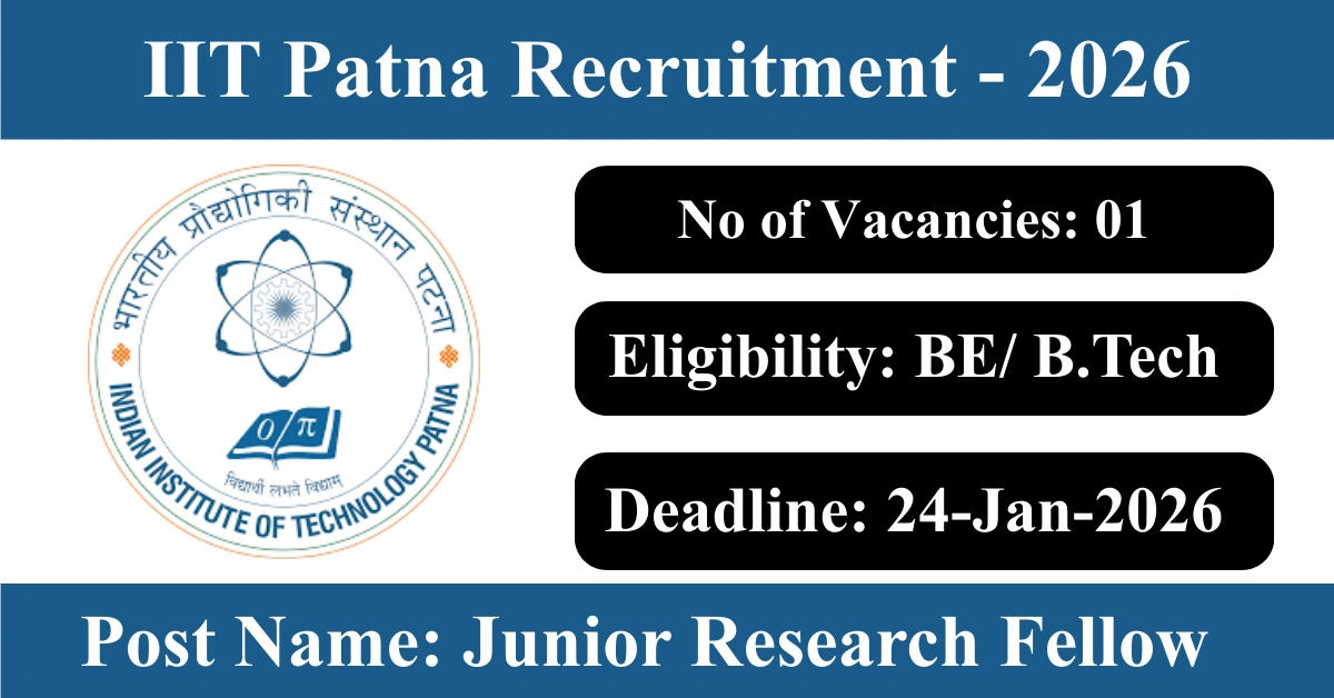 IIT Patna Recruitment 2026: Apply for 1 Junior Research Fellow vacancies. Indian Institute of Technology Patna invited applications from eligible and interested candidates to fill up Junior Research Fellow Posts through IIT Patna official notification December 2025. Job seekers who are looking for a career in Patna – Bihar Government can make use of this opportunity. Interested candidates can send an E-Mail on or before 24-Jan-2026