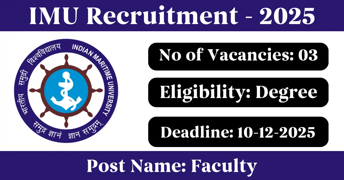 IMU Recruitment 2025: Apply for 3 Faculty vacancies. Indian Maritime University invited applications from eligible and interested candidates to fill up Faculty Posts through IMU official notification November 2025. Job seekers who are looking for a career in Mumbai – Maharashtra Government can make use of this opportunity. Interested candidates can send an E-Mail on or before 10-Dec-2025