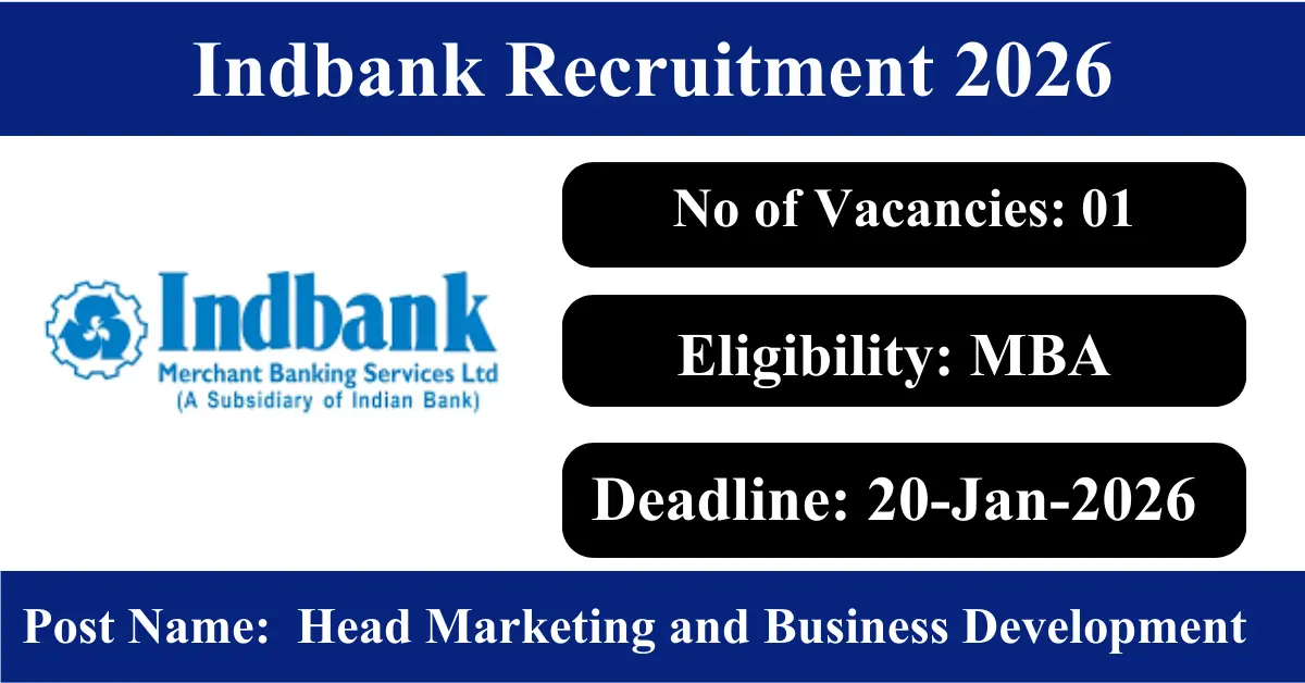 Indbank Recruitment 2026: Apply for 01 Head Marketing and Business Development vacancies. Indbank Merchant Banking Services Limited invited applications from eligible and interested candidates to fill up Head Marketing and Business Development Posts through Indbank official notification December 2025. Job seekers who are looking for a career in Mumbai – Maharashtra Government can make use of this opportunity. Interested candidates can Apply Offline on or before 20-Jan-2026