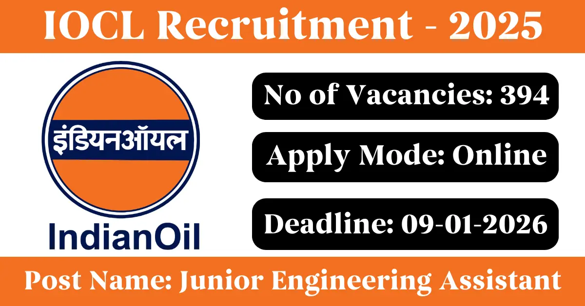 IOCL Recruitment 2025: Apply for 394 Junior Engineering Assistant vacancies. Indian Oil Corporation Limited invited applications from eligible and interested candidates to fill up Junior Engineering Assistant Posts through IOCL official notification December 2025. Job seekers who are looking for a career in Begusarai – Bihar, Jagatsinghpur – Odisha, Panipat – Haryana, Mathura – Uttar Pradesh, Purba Medinipur – West Bengal, Gujarat, Tinsukia, Guwahati, Bongaigaon- Assam Government can make use of this opportunity. Interested candidates can Apply Online on or before 09-Jan-2026