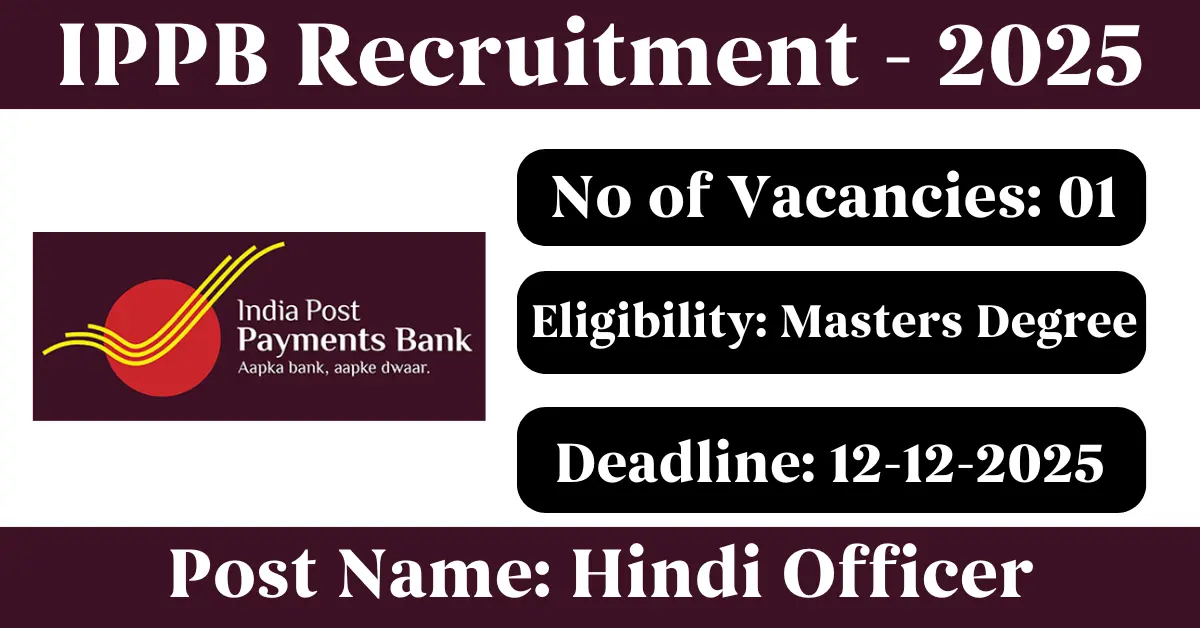 IPPB Recruitment 2025: Apply for 1 Hindi Officer vacancies. India Post Payments Bank invited applications from eligible and interested candidates to fill up Hindi Officer Posts through IPPB official notification November 2025. Job seekers who are looking for a career in Delhi – New Delhi Government can make use of this opportunity. Interested candidates can Apply Offline on or before 12-Dec-2025