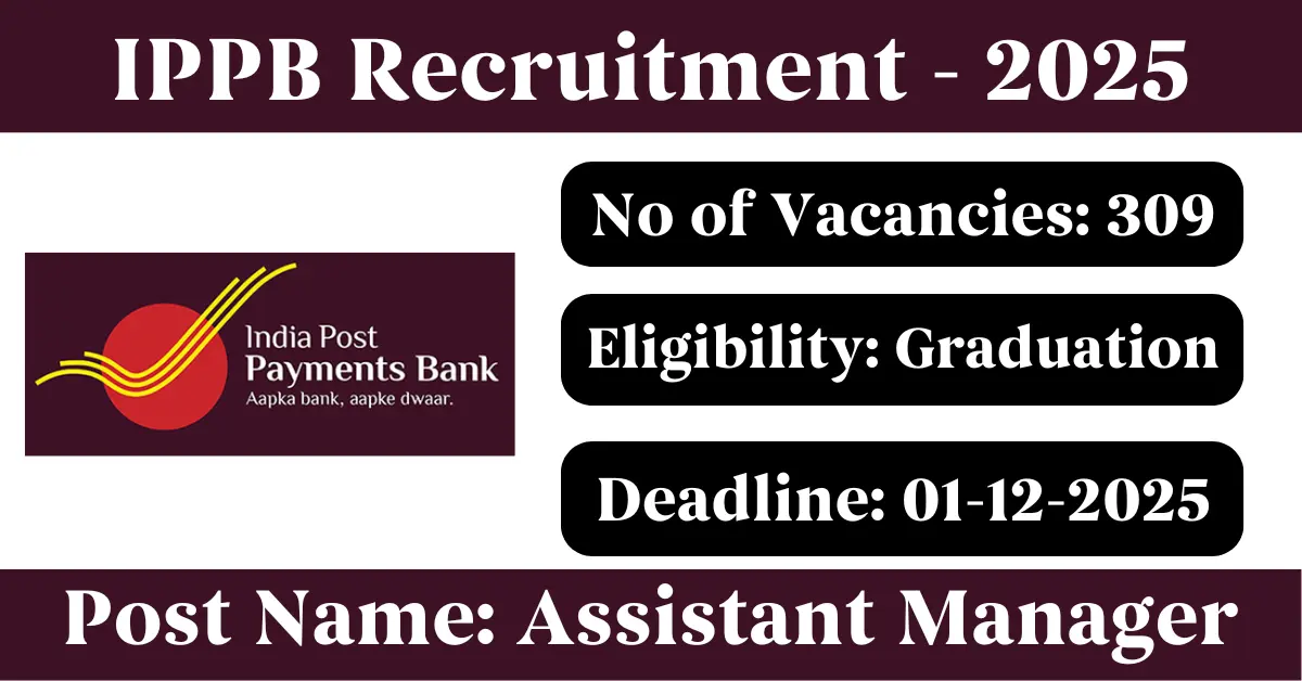 IPPB Recruitment 2025: Apply for 309 Assistant Manager, Junior Associate vacancies. India Post Payments Bank invited applications from eligible and interested candidates to fill up Assistant Manager, Junior Associate Posts through IPPB official notification November 2025. Job seekers who are looking for a career in All India Government can make use of this opportunity. Interested candidates can Apply Online on or before 01-Dec-2025