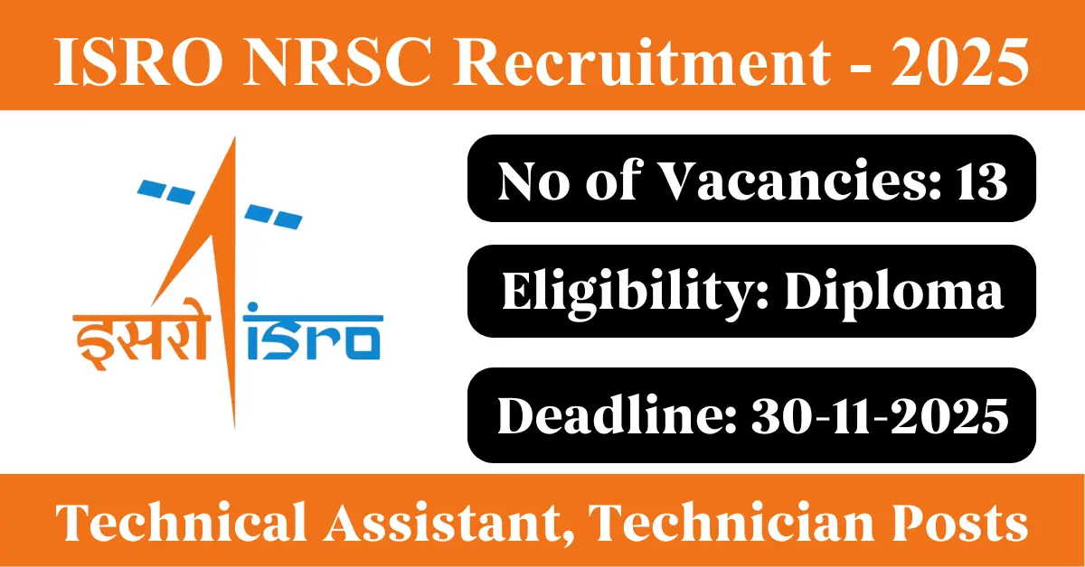 ISRO NRSC Recruitment 2025: Apply for 13 Technical Assistant, Technician vacancies. National Remote Sensing Centre invited applications from eligible and interested candidates to fill up Technical Assistant, Technician Posts through ISRO NRSC official notification November 2025. Job seekers who are looking for a career in Sangareddy – Telangana Government can make use of this opportunity. Interested candidates can Apply Online on or before 30-Nov-2025