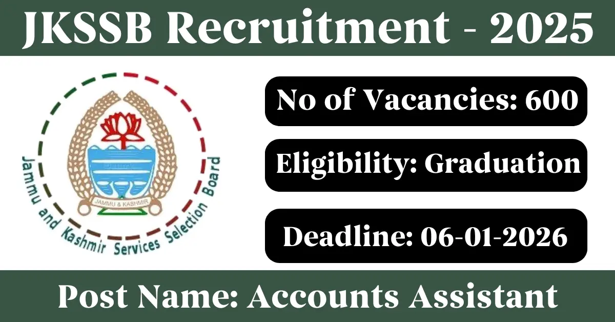 JKSSB Recruitment 2025: Apply for 600 Accounts Assistant vacancies. Jammu and Kashmir Services Selection Board invited applications from eligible and interested candidates to fill up Accounts Assistant Posts through JKSSB official notification November 2025. Job seekers who are looking for a career in Jammu & Kashmir Government can make use of this opportunity. Interested candidates can Apply Online on or before 06-Jan-2026