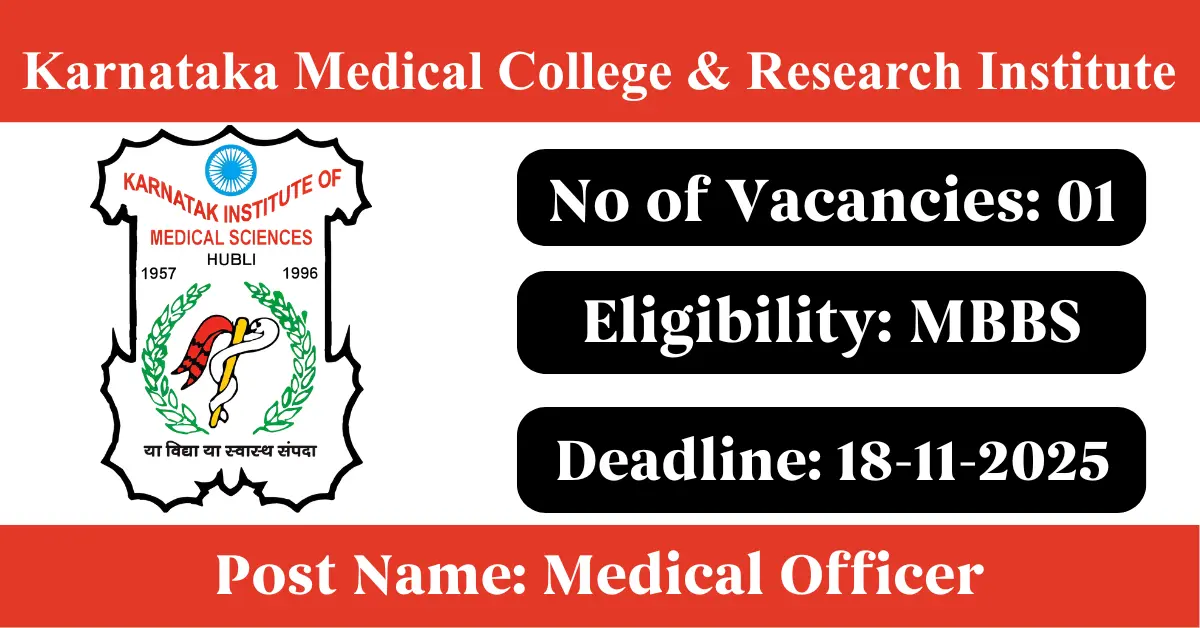 Karnataka Medical College & Research Institute Recruitment 2025: Apply for 1 Medical Officer vacancies. Karnataka Medical College & Research Institute invited applications from eligible and interested candidates to fill up Medical Officer Posts through Karnataka Medical College & Research Institute official notification November 2025. Job seekers who are looking for a career in Hubballi – Karnataka Government can make use of this opportunity. Interested candidates can attend for Walk-in-interview on 18-Nov-2025