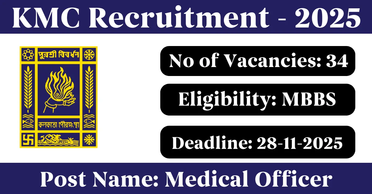 KMC Recruitment 2025: Apply for 34 Medical Officer vacancies. Kolkata Municipal Corporation invited applications from eligible and interested candidates to fill up Medical Officer Posts through KMC official notification November 2025. Job seekers who are looking for a career in Kolkata – West Bengal Government can make use of this opportunity. Interested candidates can attend for Walk-in-interview on 28-Nov-2025
