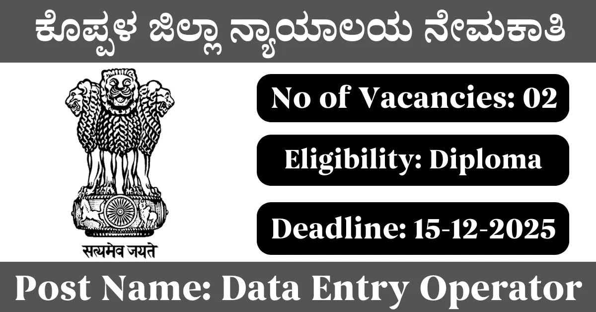 Koppal District Court Recruitment 2025: Apply for 2 Data Entry Operator vacancies. Koppal eCourt invited applications from eligible and interested candidates to fill up Data Entry Operator Posts through Koppal District Court official notification December 2025. Job seekers who are looking for a career in Koppal – Karnataka Government can make use of this opportunity. Interested candidates can Apply Offline on or before 15-Dec-2025