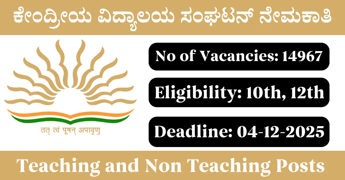 KVS Recruitment 2025: Apply for 14967 Teaching and Non Teaching vacancies. Kendriya Vidyalaya Sangathan invited applications from eligible and interested candidates to fill up Teaching and Non Teaching Posts through KVS official notification November 2025. Job seekers who are looking for a career in All India Government can make use of this opportunity. Interested candidates can Apply Online on or before 04-Dec-2025