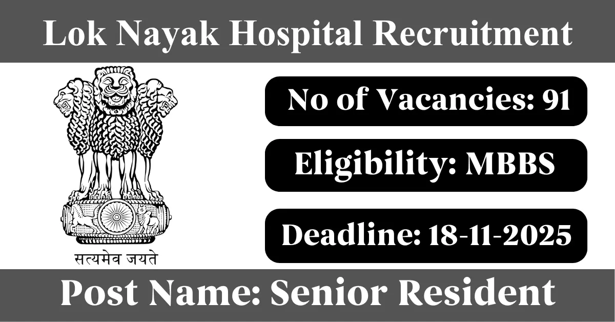 Lok Nayak Hospital Recruitment 2025: Apply for 91 Senior Resident vacancies. Lok Nayak Hospital invited applications from eligible and interested candidates to fill up Senior Resident Posts through Lok Nayak Hospital official notification November 2025. Job seekers who are looking for a career in Delhi – New Delhi Government can make use of this opportunity. Interested candidates can attend for Walk-in-interview on 18-Nov-2025
