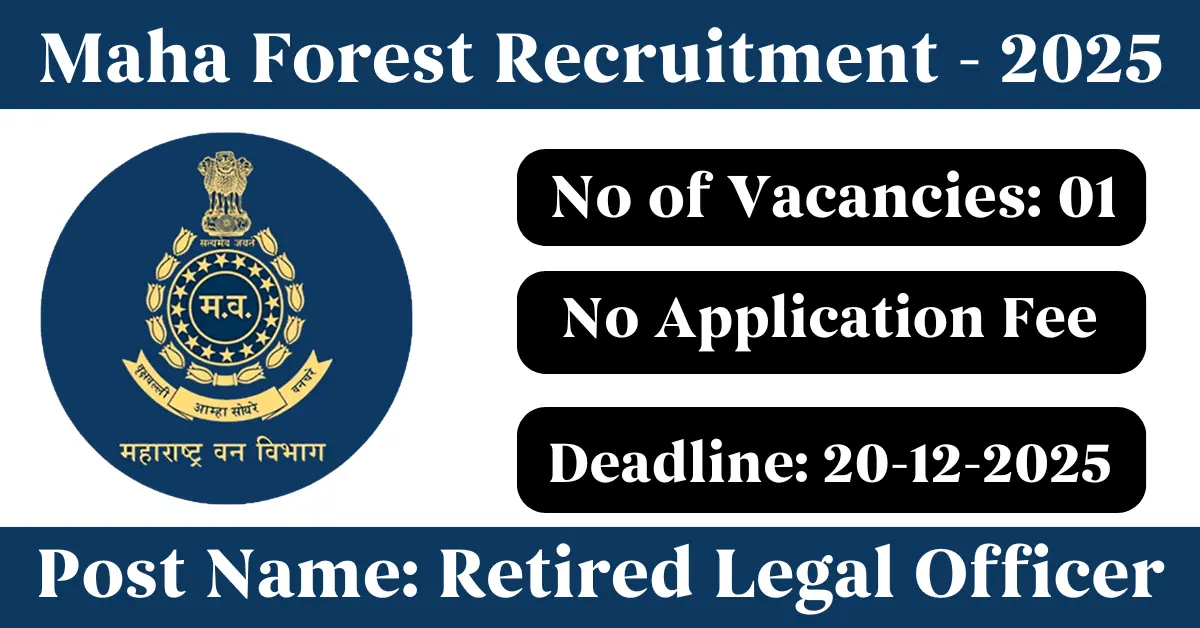 Maha Forest Recruitment 2025: Apply for 1 Retired Legal Officer vacancies. Maharashtra Forest Department invited applications from eligible and interested candidates to fill up Retired Legal Officer Posts through Maha Forest official notification November 2025. Job seekers who are looking for a career in Nagpur – Maharashtra Government can make use of this opportunity. Interested candidates can Apply Offline on or before 20-Dec-2025