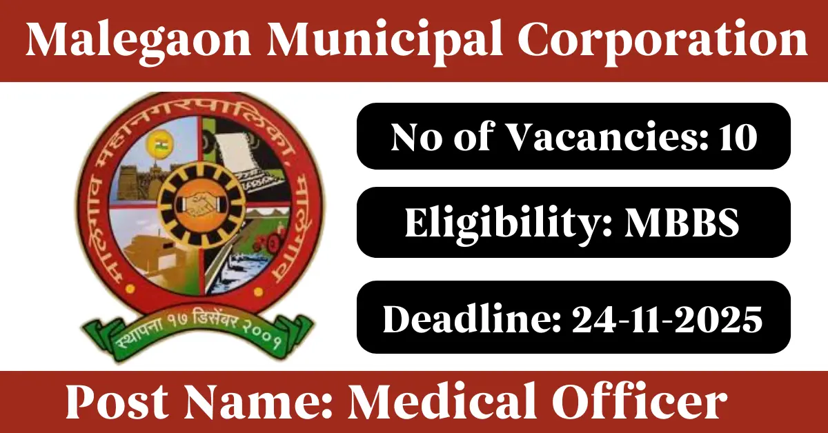 Malegaon Municipal Corporation Recruitment 2025: Apply for 10 Medical Officer vacancies. Malegaon Municipal Corporation invited applications from eligible and interested candidates to fill up Medical Officer Posts through Malegaon Municipal Corporation official notification November 2025. Job seekers who are looking for a career in Nashik – Maharashtra Government can make use of this opportunity. Interested candidates can Apply Offline on or before 24-Nov-2025