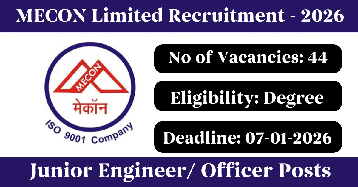 MECON Recruitment 2025: Apply for 44 Junior Engineer/ Officer vacancies. Metallurgical & Engineering Consultants Limited invited applications from eligible and interested candidates to fill up Junior Engineer/ Officer Posts through MECON official notification December 2025. Job seekers who are looking for a career in All India Government can make use of this opportunity. Interested candidates can Apply Online on or before 06-Jan-2026.