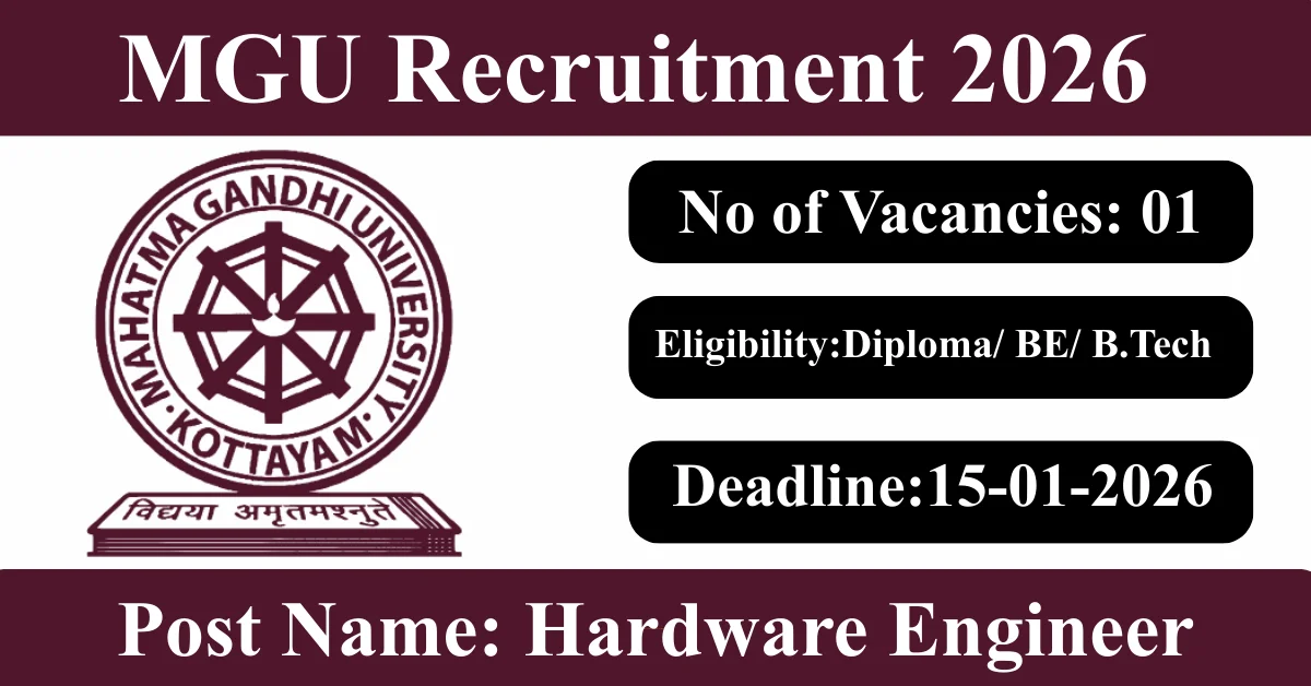 MGU Recruitment 2026: Apply for 1 Hardware Engineer vacancies. Mahatma Gandhi University invited applications from eligible and interested candidates to fill up Hardware Engineer Posts through MGU official notification January 2026. Job seekers who are looking for a career in Kottayam – Kerala Government can make use of this opportunity. Interested candidates can send an E-Mail on or before 15-Jan-2026