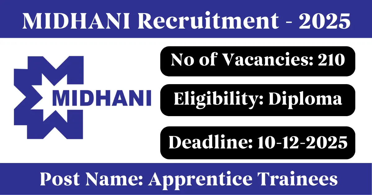 MIDHANI Recruitment 2025: Apply for 210 Apprentice Trainees vacancies. Mishra Dhatu Nigam Limited invited applications from eligible and interested candidates to fill up Apprentice Trainees Posts through MIDHANI official notification November 2025. Job seekers who are looking for a career in Hyderabad – Telangana Government can make use of this opportunity. Interested candidates can Apply Online on or before 10-Dec-2025