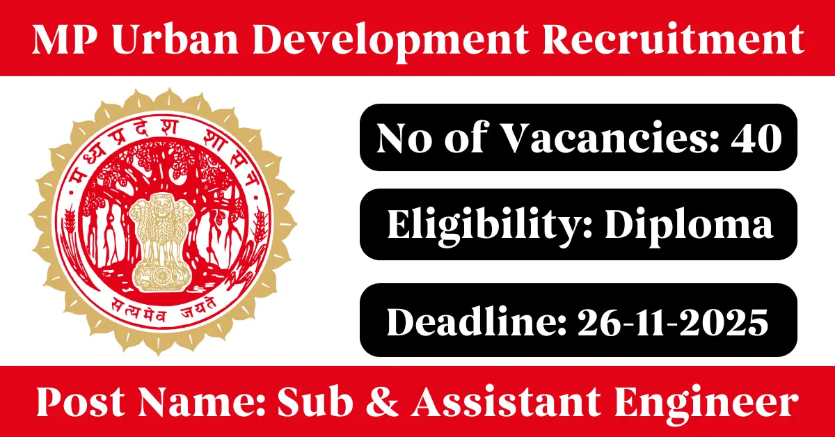 MP Urban Development Recruitment 2025: Apply for 40 Sub Engineer vacancies. Madhya Pradesh Urban Development and Housing Department invited applications from eligible and interested candidates to fill up Sub Engineer Posts through MP Urban Development official notification November 2025. Job seekers who are looking for a career in Madhya Pradesh Government can make use of this opportunity. Interested candidates can Apply Online on or before 26-Nov-2025