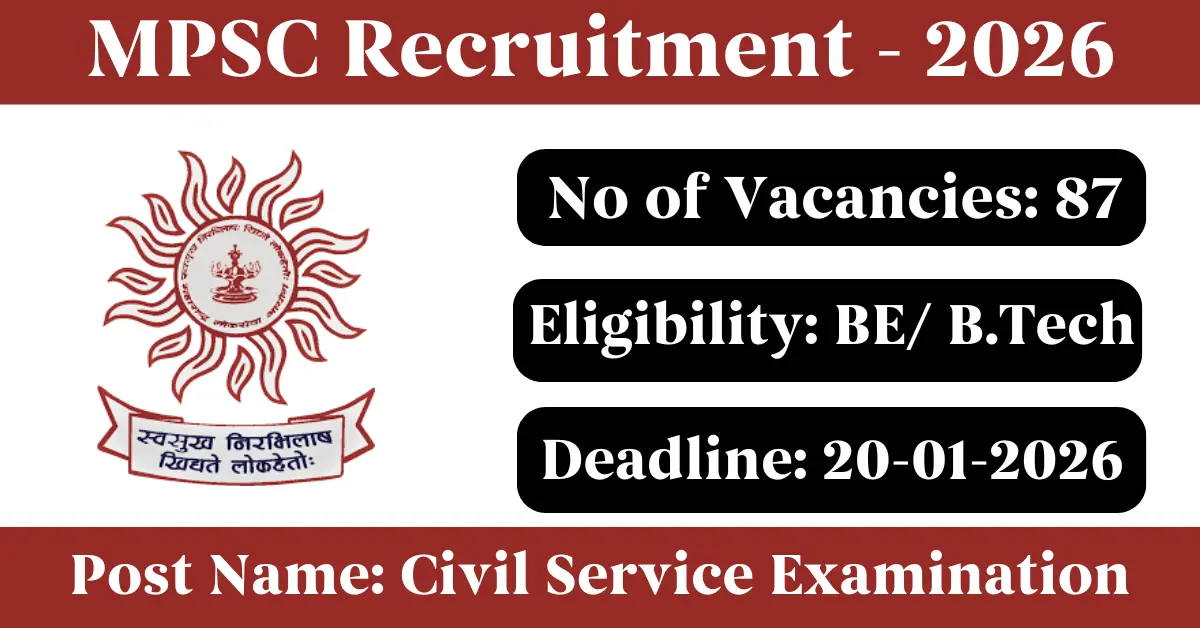 MPSC Recruitment 2026: Apply for 87 Civil Service Examination vacancies. Maharashtra Public Service Commission invited applications from eligible and interested candidates to fill up Civil Service Examination Posts through MPSC official notification December 2025. Job seekers who are looking for a career in Maharashtra Government can make use of this opportunity. Interested candidates can Apply Online on or before 20-Jan-2026