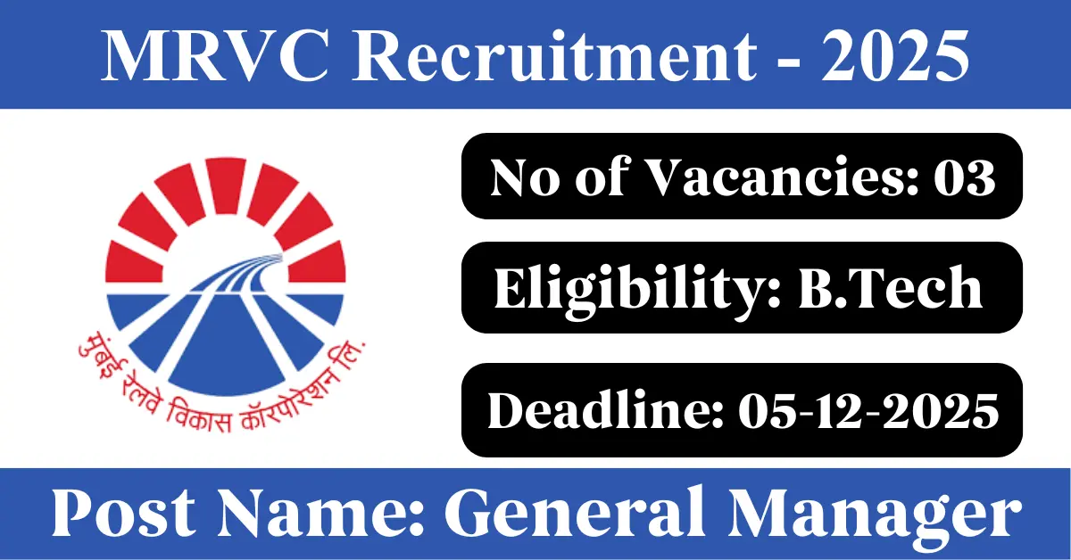 MRVC Recruitment 2025: Apply for 3 AGM/ JGM/ DGM vacancies. Mumbai Railway Vikas Corporation invited applications from eligible and interested candidates to fill up AGM/ JGM/ DGM Posts through MRVC official notification November 2025. Job seekers who are looking for a career in Mumbai – Maharashtra Government can make use of this opportunity. Interested candidates can Apply Offline on or before 05-Dec-2025