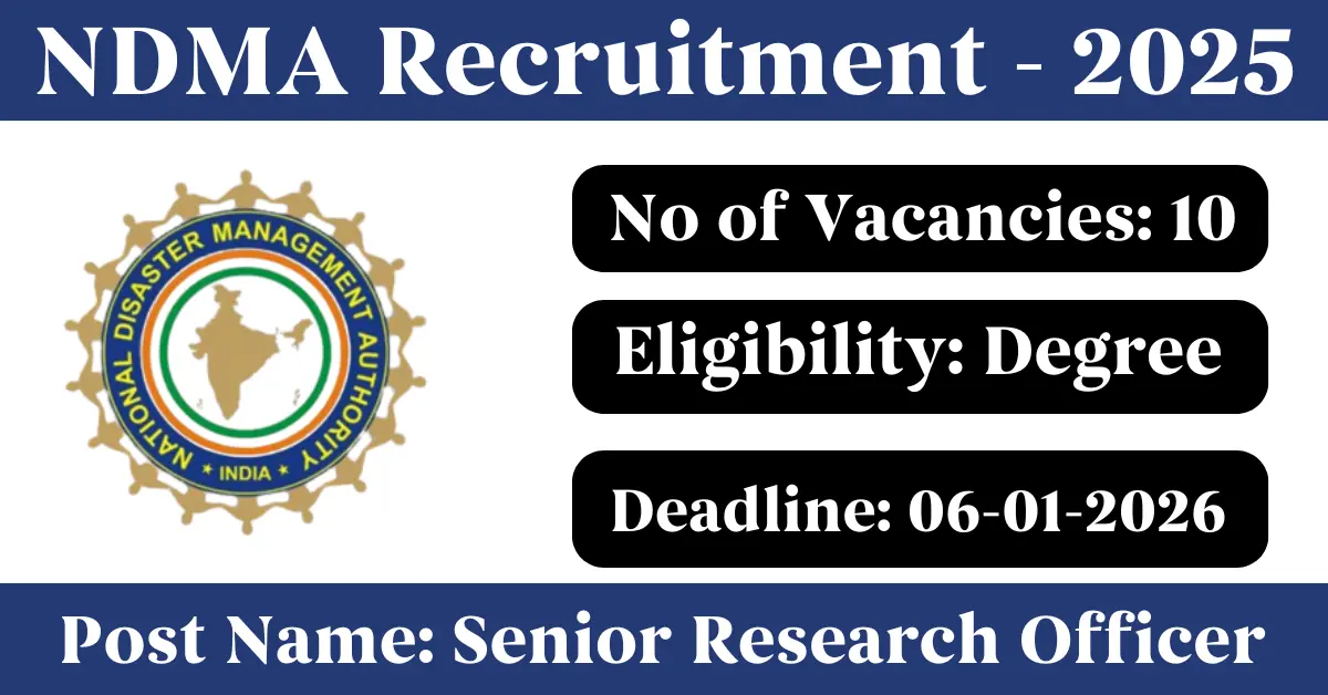 NDMA Recruitment 2025: Apply for 10 Senior Research Officer vacancies. National Disaster Management Authority invited applications from eligible and interested candidates to fill up Senior Research Officer Posts through NDMA official notification November 2025. Job seekers who are looking for a career in Delhi – New Delhi Government can make use of this opportunity. Interested candidates can Apply Offline on or before 06-Jan-2026