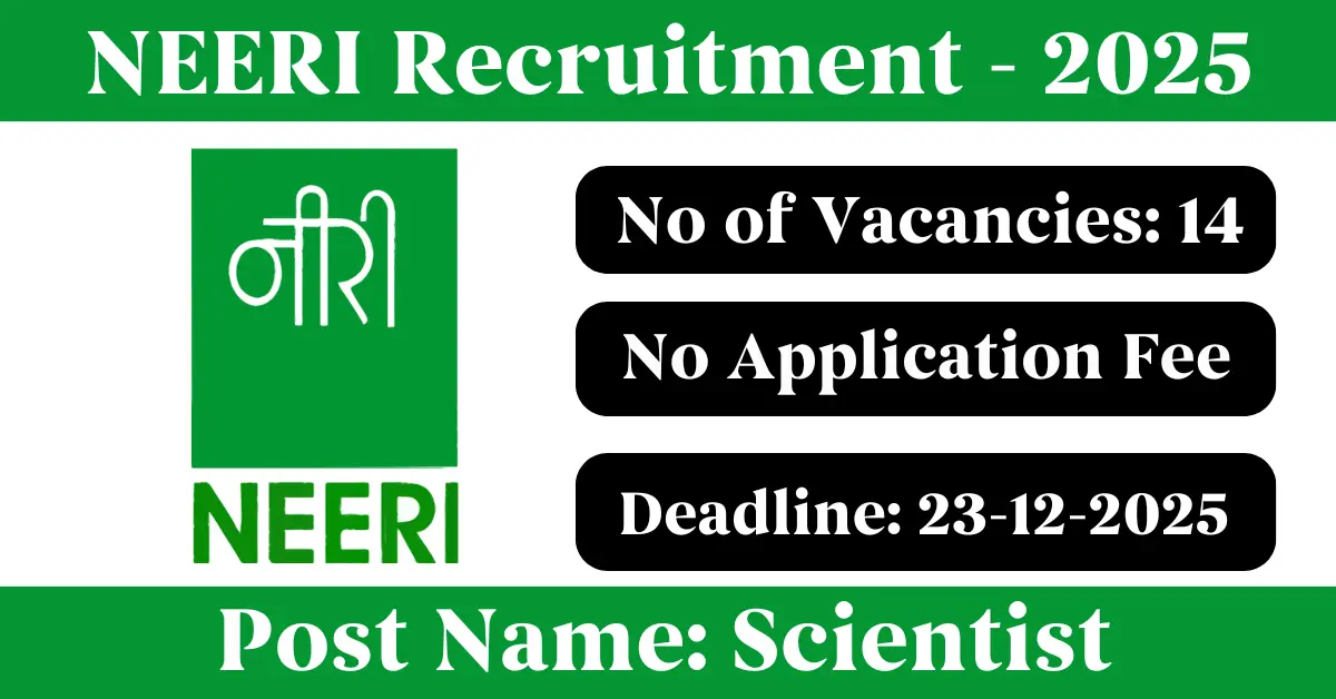 NEERI Recruitment 2025: Apply for 14 Scientist vacancies. National Environmental Engineering Research Institute invited applications from eligible and interested candidates to fill up Scientist Posts through NEERI official notification November 2025. Job seekers who are looking for a career in Nagpur – Maharashtra Government can make use of this opportunity. Interested candidates can Apply Online on or before 23-Dec-2025