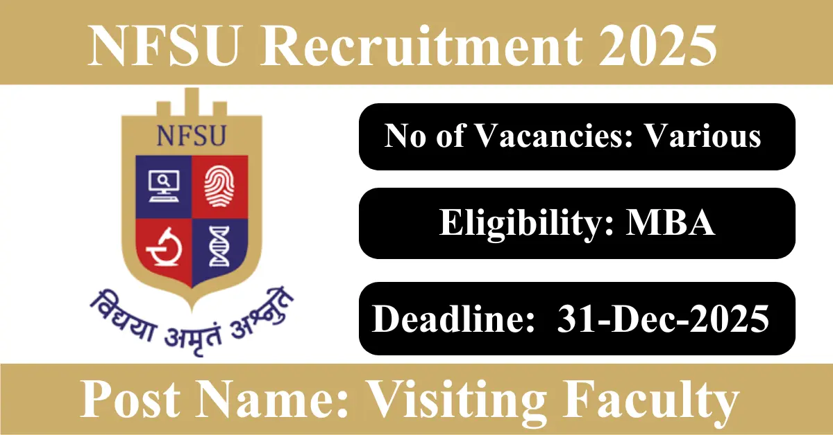 NFSU Recruitment 2026: Apply for Various Visiting Faculty vacancies. National Forensic Sciences University invited applications from eligible and interested candidates to fill up Visiting Faculty Posts through NFSU official notification December 2025. Job seekers who are looking for a career in Dharwad – Karnataka Government can make use of this opportunity. Interested candidates can Apply Online on or before 31-Dec-2025