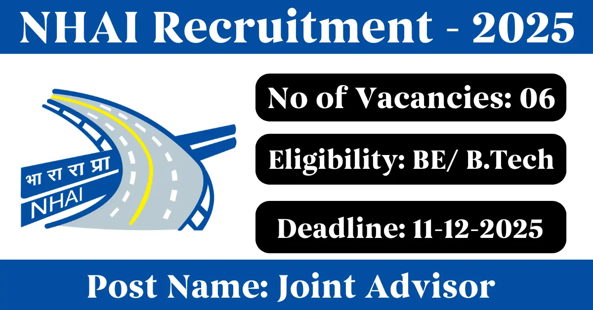 NHAI Recruitment 2025: Apply for 6 Advisor vacancies. National Highways Authority of India invited applications from eligible and interested candidates to fill up Advisor Posts through NHAI official notification November 2025. Job seekers who are looking for a career in Delhi – New Delhi Government can make use of this opportunity. Interested candidates can Apply Online on or before 11-Dec-2025