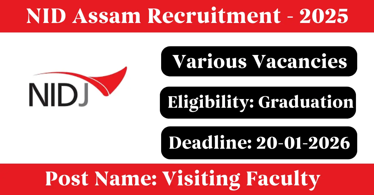 NID Assam Recruitment 2025: Apply for Various Visiting Faculty vacancies. National Institute of Design Assam invited applications from eligible and interested candidates to fill up Visiting Faculty Posts through NID Assam official notification December 2025. Job seekers who are looking for a career in Jorhat – Assam Government can make use of this opportunity. Interested candidates can Apply Online on or before 20-Jan-2026