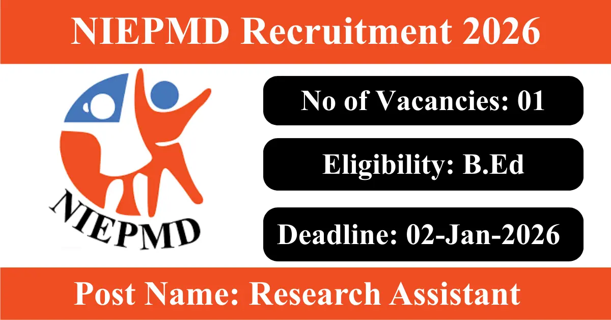 NIEPMD Recruitment 2026: Apply for 1 Research Assistant vacancies. National Institute for Empowerment of Persons with Multiple Disabilities invited applications from eligible and interested candidates to fill up Research Assistant Posts through NIEPMD official notification December 2025. Job seekers who are looking for a career in Chennai – Tamil Nadu Government can make use of this opportunity. Interested candidates can attend for Walk-in-interview on 02-Jan-2026