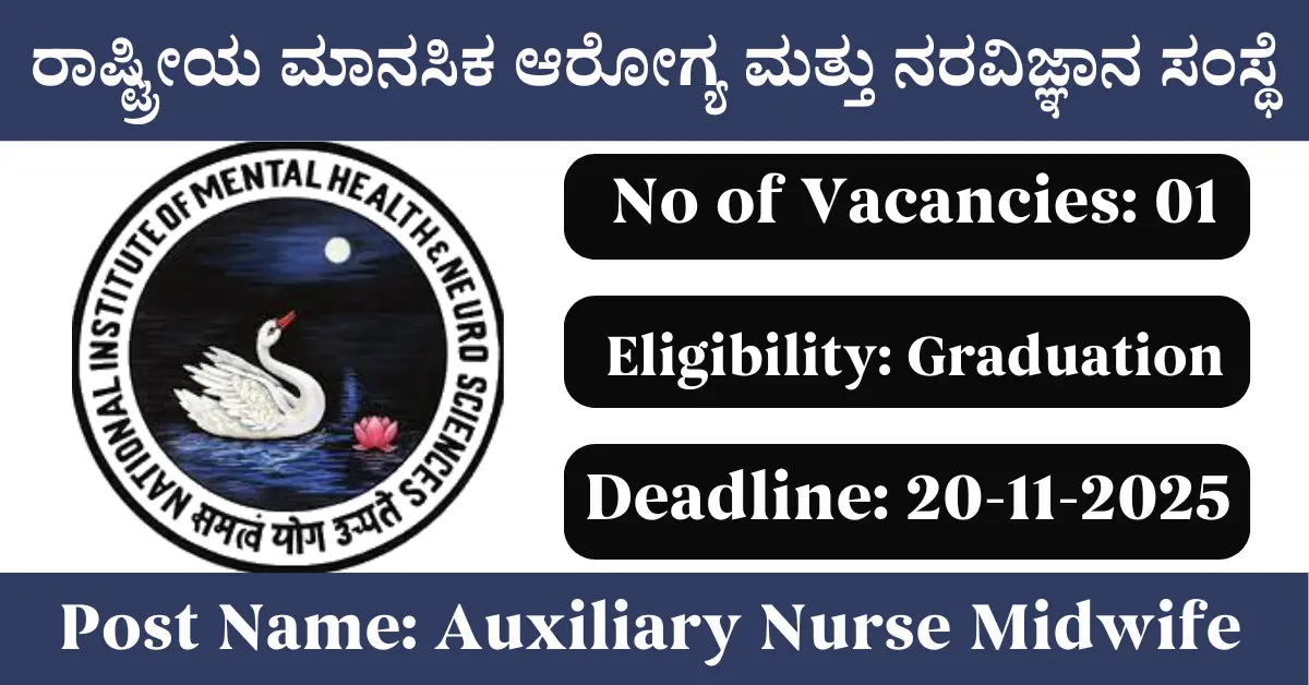 NIMHANS Recruitment 2025: Apply for 1 Auxiliary Nurse Midwife vacancies. National Institute of Mental Health and Neuro Sciences invited applications from eligible and interested candidates to fill up Auxiliary Nurse Midwife Posts through NIMHANS official notification November 2025. Job seekers who are looking for a career in Bengaluru – Karnataka Government can make use of this opportunity. Interested candidates can attend for Walk-in-interview on 20-Nov-2025