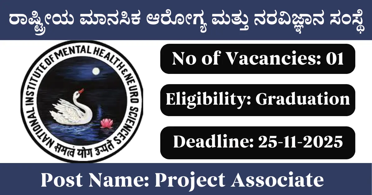 NIMHANS Recruitment 2025: Apply for 1 Project Associate vacancies. National Institute of Mental Health and Neuro Sciences invited applications from eligible and interested candidates to fill up Project Associate Posts through NIMHANS official notification November 2025. Job seekers who are looking for a career in Bengaluru – Karnataka Government can make use of this opportunity. Interested candidates can attend for Walk-in-interview on 25-Nov-2025