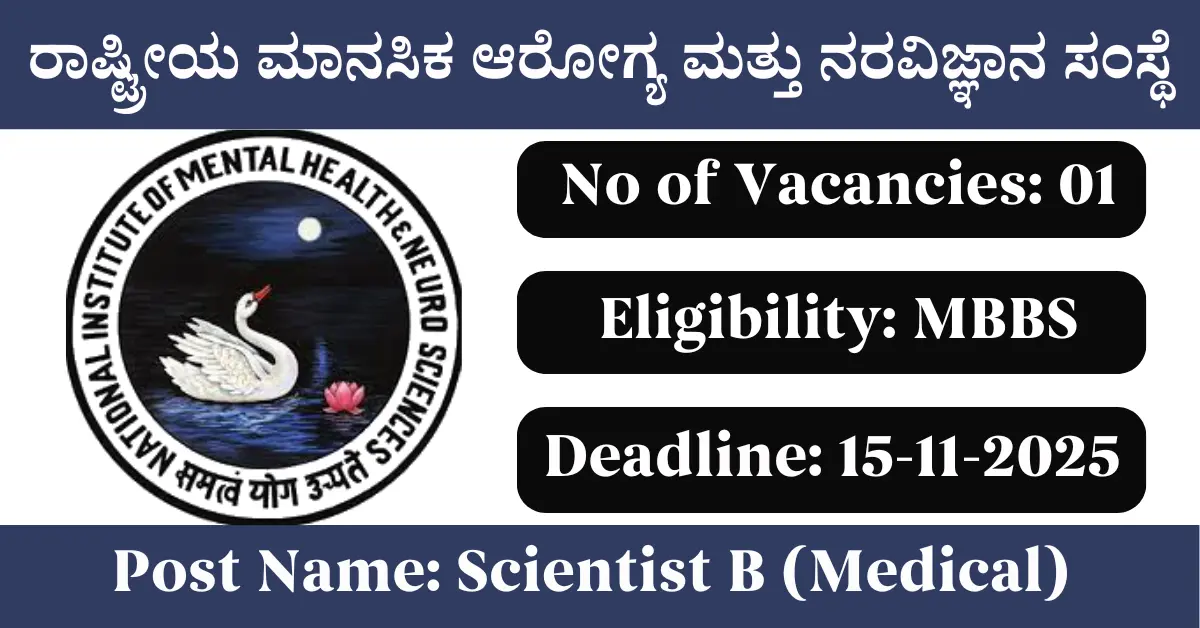 NIMHANS Recruitment 2025: Apply for 1 Scientist B (Medical) vacancies. National Institute of Mental Health and Neuro Sciences invited applications from eligible and interested candidates to fill up Scientist B (Medical) Posts through NIMHANS official notification November 2025. Job seekers who are looking for a career in Bengaluru – Karnataka Government can make use of this opportunity. Interested candidates can attend for Walk-in-interview on 15-Nov-2025