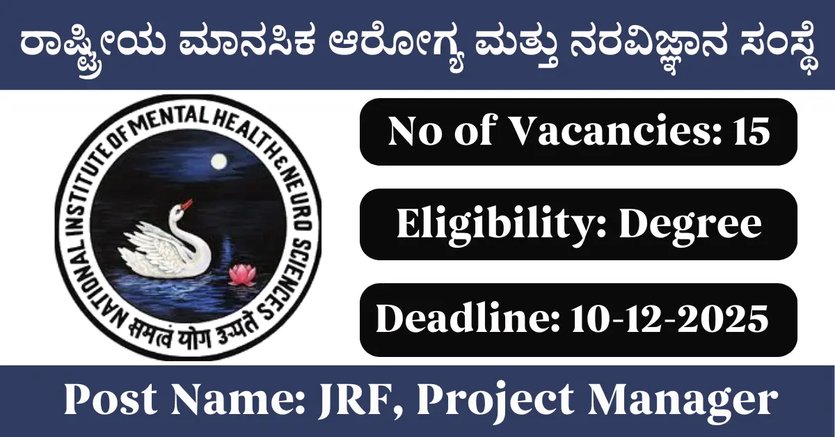 NIMHANS Recruitment 2025: Apply for 15 JRF, Project Manager vacancies. National Institute of Mental Health and Neuro Sciences invited applications from eligible and interested candidates to fill up JRF, Project Manager Posts through NIMHANS official notification December 2025. Job seekers who are looking for a career in Solan – Himachal Pradesh, Krishnagiri – Tamil Nadu, Mysore, Bengaluru – Karnataka Government can make use of this opportunity. Interested candidates can attend for Walk-in-interview on 10-Dec-2025