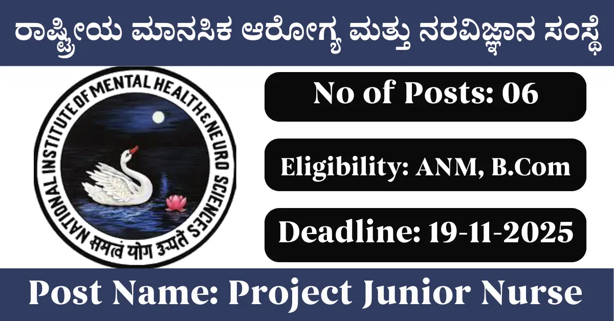 NIMHANS Recruitment 2025: Apply for 6 Project Junior Nurse vacancies. National Institute of Mental Health and Neuro Sciences invited applications from eligible and interested candidates to fill up Project Junior Nurse Posts through NIMHANS official notification November 2025. Job seekers who are looking for a career in Bengaluru – Karnataka Government can make use of this opportunity. Interested candidates can attend for Walk-in-interview on 19-Nov-2025