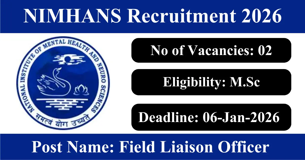 NIMHANS Recruitment 2026: Apply for 2 Field Liaison Officer vacancies. National Institute of Mental Health and Neuro Sciences invited applications from eligible and interested candidates to fill up Field Liaison Officer Posts through NIMHANS official notification December 2025. Job seekers who are looking for a career in Bengaluru – Karnataka Government can make use of this opportunity. Interested candidates can attend for Walk-in-interview on 06-Jan-2026