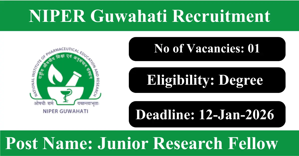 NIPER Guwahati Recruitment 2026: Apply for 1 Junior Research Fellow vacancies. National Institute of Pharmaceutical Education and Research Guwahati invited applications from eligible and interested candidates to fill up Junior Research Fellow Posts through NIPER Guwahati official notification December 2025. Job seekers who are looking for a career in Guwahati – Assam Government can make use of this opportunity. Interested candidates can Apply Online on or before 12-Jan-2026